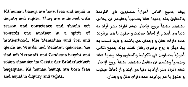 Source: Arabetics™ Designer: Saad D. Abulhab Year: 2013 Description: Arabetics Harfi is a Latin Serif typeface with a comprehensive support for the Arabetic scripts, including Quranic texts. Careful spacing and kerning was used to enhance resulting text legibility both scripts. Arabetics Harfi fully supports MS 1252 Western and 1256 Arabic code pages, in addition to all transliteration characters required by the ALA-LC Romanization tables. Users can either select an accented character directly or form it by keying the desired combining diacritic mark following an unaccented character. For Arabic, it fully supports Unicode 6.1, and the latest Arabic Supplement and Extended-A Unicode blocks. The Arabic design of this font family follows the Mutamathil Taqlidi type style with connected glyphs, but it emphasizes a horizontal look and feel rather than verticalone, utilizing slightly varying x-heights. The Mutamathil Taqlidi type style uses one glyph per every basic Arabic Unicode character or letter, as defined by the Unicode Standards, and one additional final form glyph, for each freely-connecting letter of the Arabic cursive text. Arabetics Harfi includes the required Lam-Alif ligatures in addition to all vowel diacritic ligatures. Soft-vowel diacritic marks (harakat) are selectively positioned with most of them appearing on similar high and low levels—top left corner—, to clearly distinguish them from the letters. Tatweel is a zero-width glyph. Arabetics Harfi includes both Arabic and Arabic-Indic numerals, in addition to generous number of punctuation and mathematical symbols. It includes two weights, regular and bold, each of which has normal, right slanted Italic, and left-slanted styles. Keywords: Latin, Arabic, Persian, Urdu, Pashtu, Kurdish, Baluchi, Kashmiri, Kazakh, Sindhi, Uyghur, Turkic, Ajami, Ajamiya, Burushaski, African, Quran, extended, simplified, Mutamathil, Romanization, Transliteration